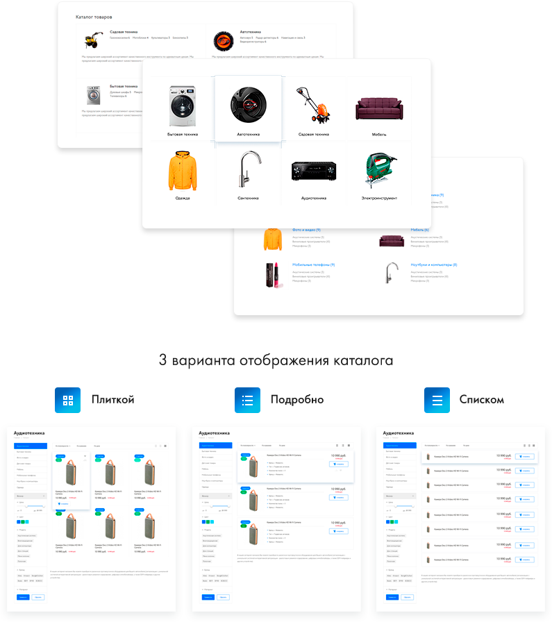 Три варианта отображения рубрик каталога: плиткой, списком с иконками, текстовым списком. Для любой категории можно задать свой вид отображения по умолчанию.